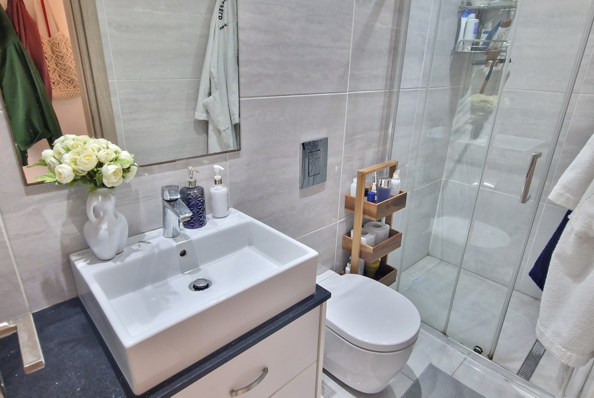 The apartment itself consists of an open plan living/dining room with kitchen, leading off to the large veranda, followed by two good-sized bedrooms, with the master bedroom having its own en-suite bathroom, and a family bathroom.
