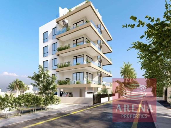 This is a three-bedroom apartment on the fourth floor of the mixed-use building in Chrysopolitissa, Larnaca.