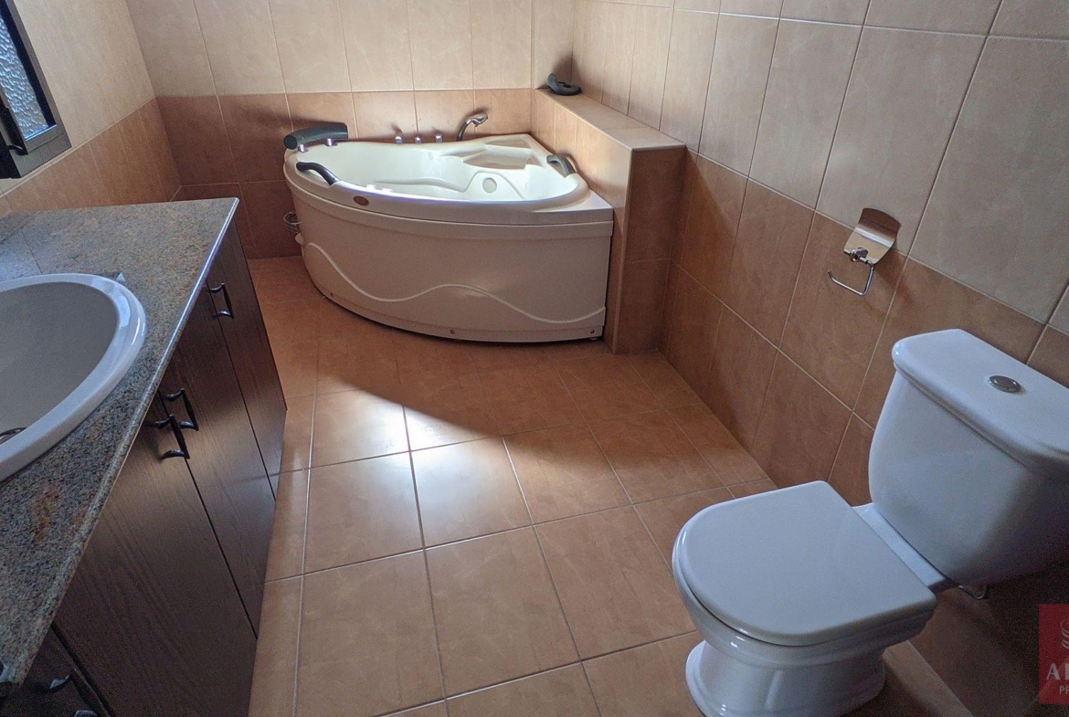 The house on the ground floor is comprised of an open plan entrance hall, sitting room, dining room, living room , a kitchen with sitting room, a guest bathroom and a staircase which leads to the upper level (split – level).