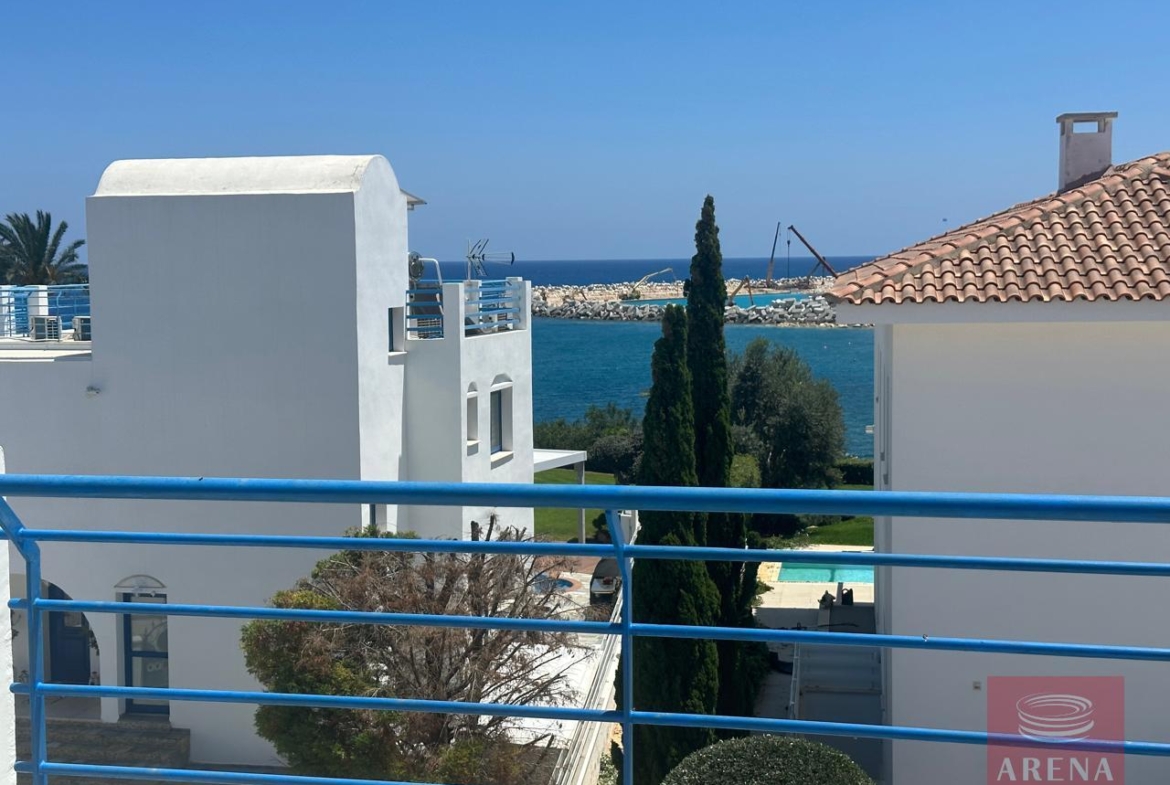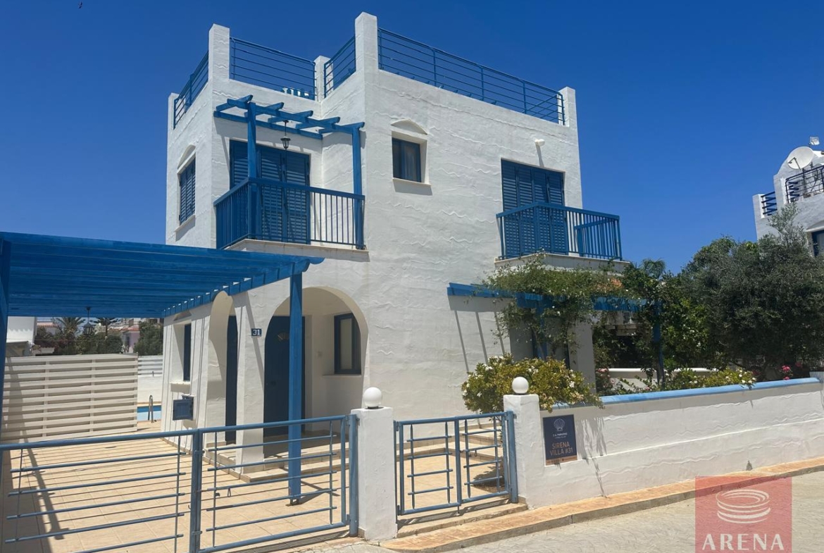The property features a classic white and blue exterior, reminiscent of Mediterranean architecture, with spacious balconies and a pergola. This house is perfect for those looking to enjoy seaside living with modern comforts.