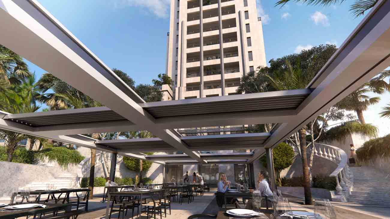To the west and east, the piazza smoothly opens into private patios, hidden from prying eyes, where in the atmosphere of a tropical garden immersed in greenery and filled with fresh plants and gurgling water, the terrace of the haute cuisine restaurant will be located.