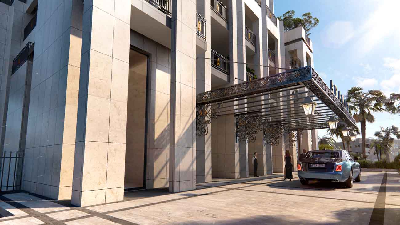 A distinctive feature of the Residences is that you can arrive not only through two formal, semicircular stairs from the west and east side of the piazza or parking, but can also take off along the majestic flyover by car directly from the promenade, through a controlled entrance, and then leave from the opposite side. The main entrance to the reception area is decorated with a majestic and massive canopy with carved elements on steel cables in the style of Art Deco.