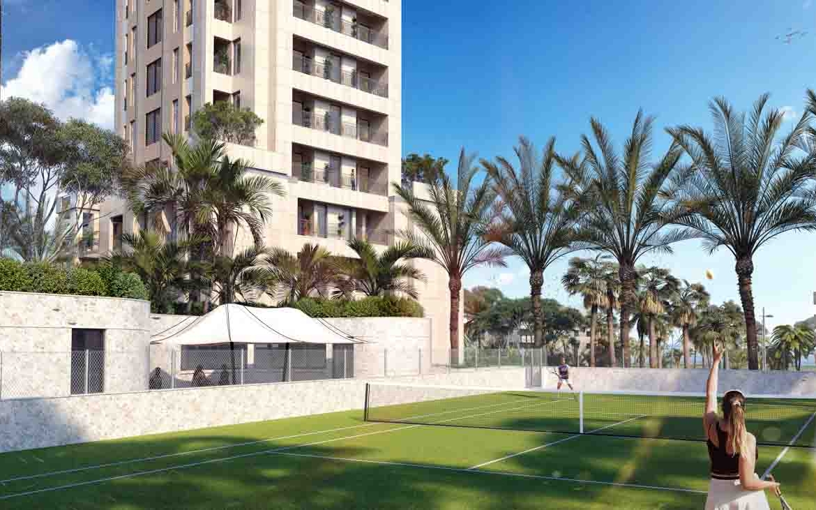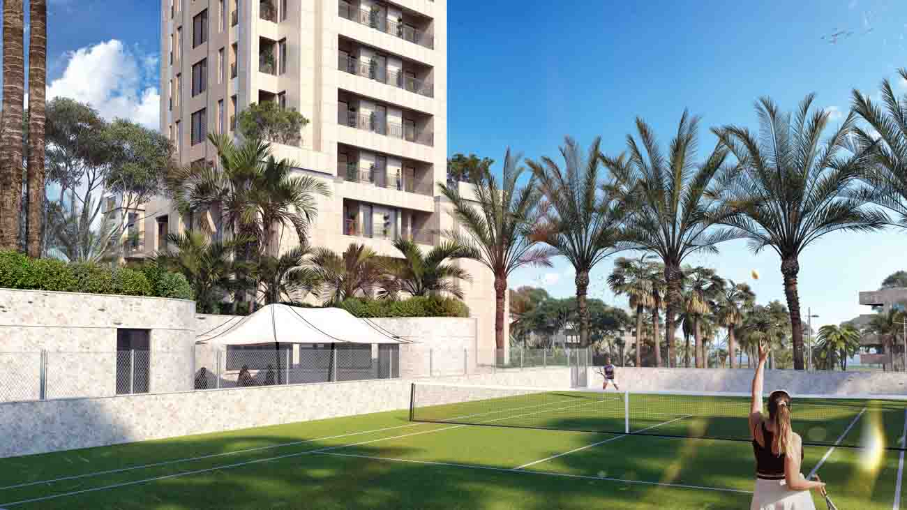 We exit to the internal patio. Here is an outdoor 25m half-Olympic size pool with an area of 250 m² (25x10m) and with it a lounge area, pool bar and a children’s pool. There is also a tennis court, a park and a playground together with a gym and locker rooms.