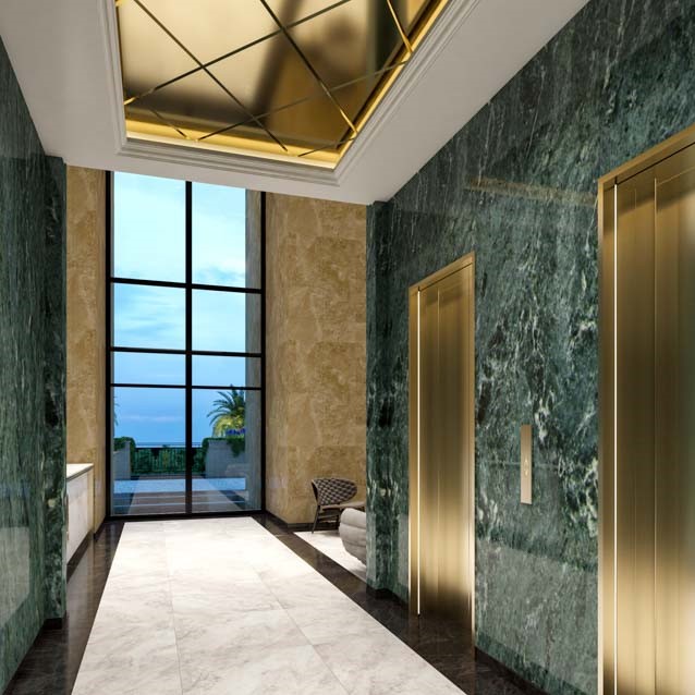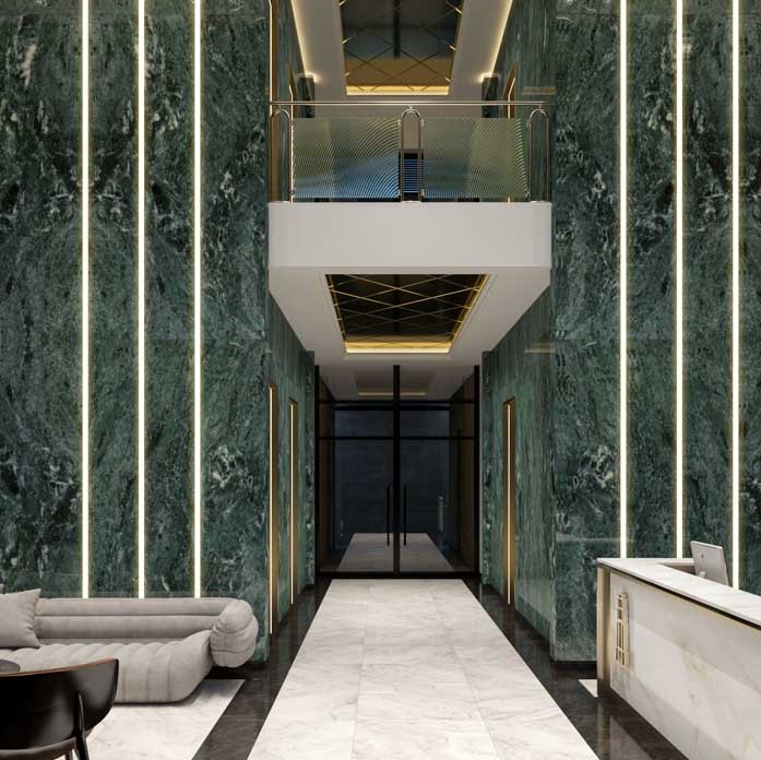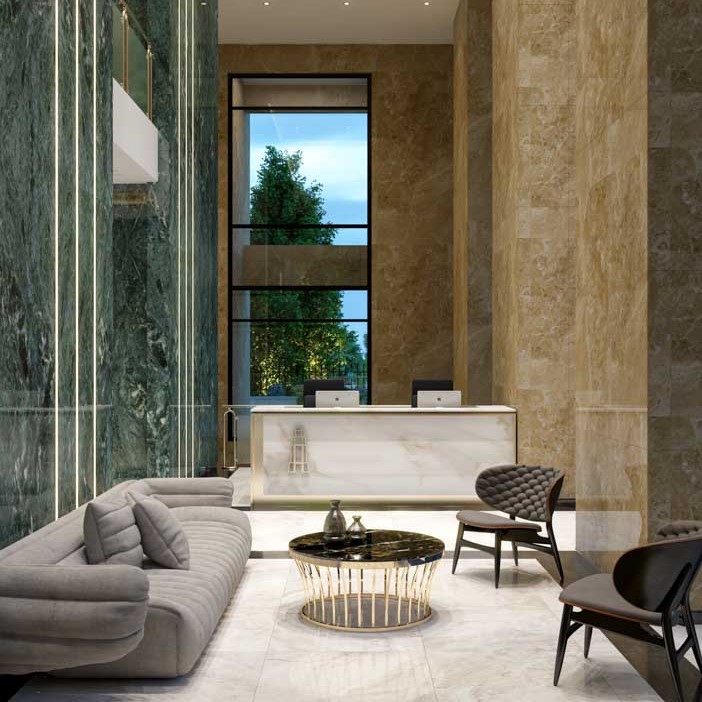 We are walking into the lobby, enjoying a variety of expensive marbles in elegant shades of beige, malachite and cream. There is a reception on two levels, where residents can take advantage of concierge services for their convenience and comfort; for example, apartment rental, cars, caring for clothes, ordering food, flowers and drinks, laundry service, security – in a word, full range of concierge services.