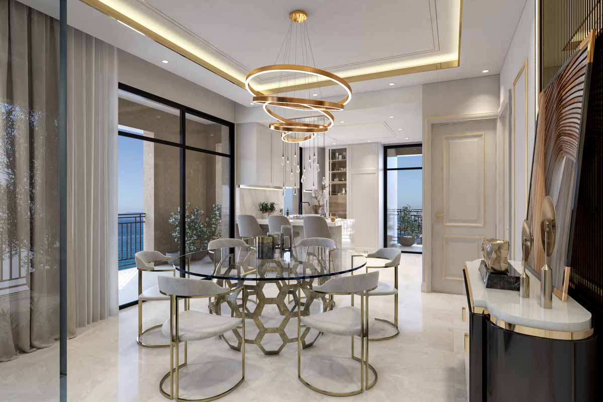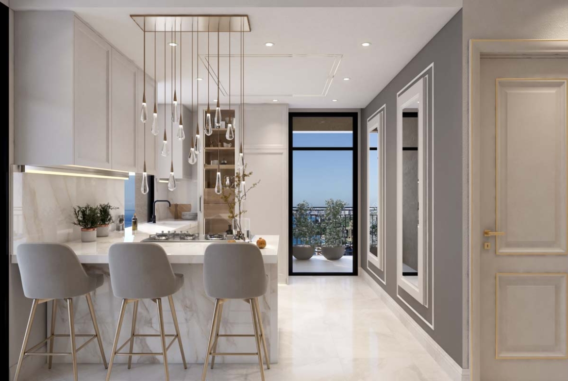 - The residence has only 16 apartments and is crowned by the 8-bedroom penthouse, a real “villa in the skies”, with a fireplace, a large infinity pool, a winter garden, a separate internal elevator and a terrace with stunning 360° panoramic views of the coast and mountains.