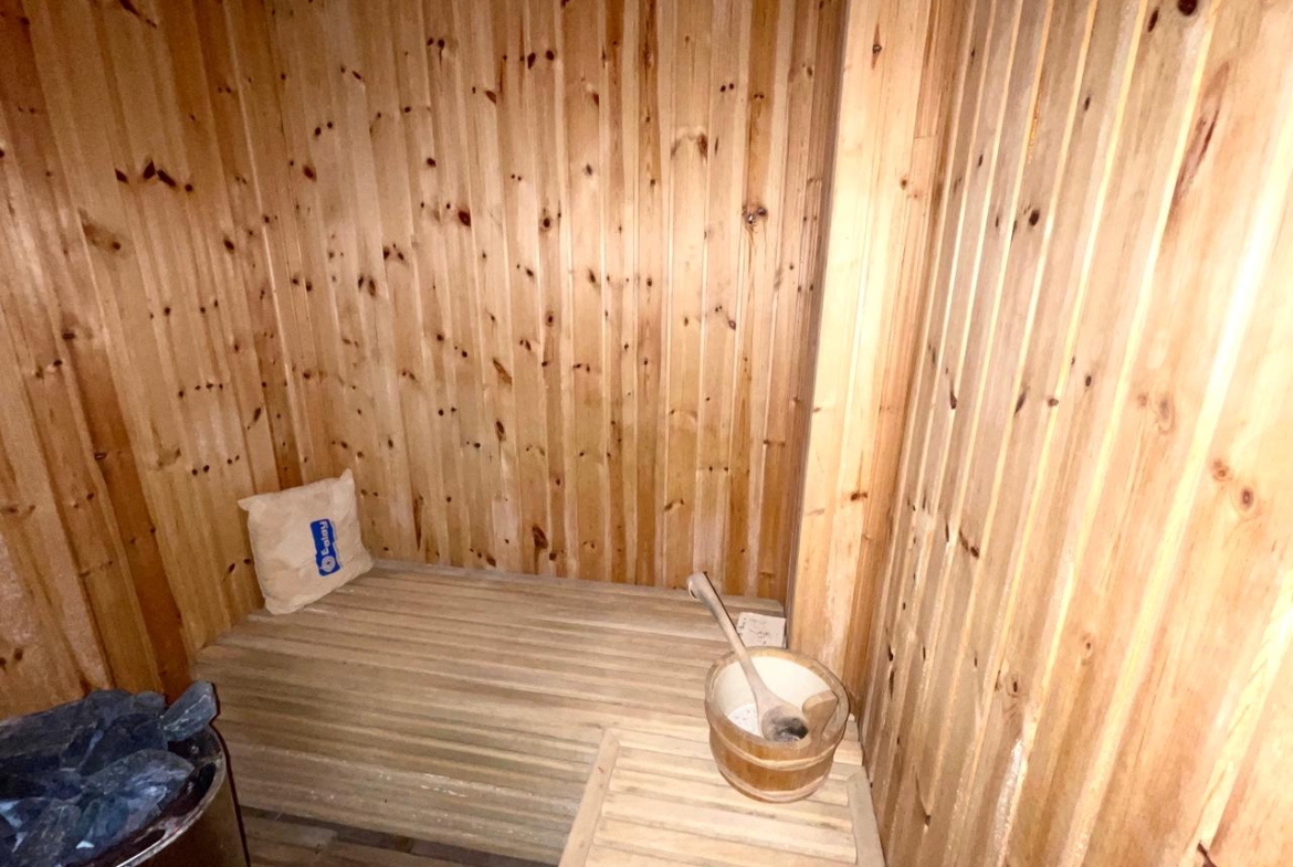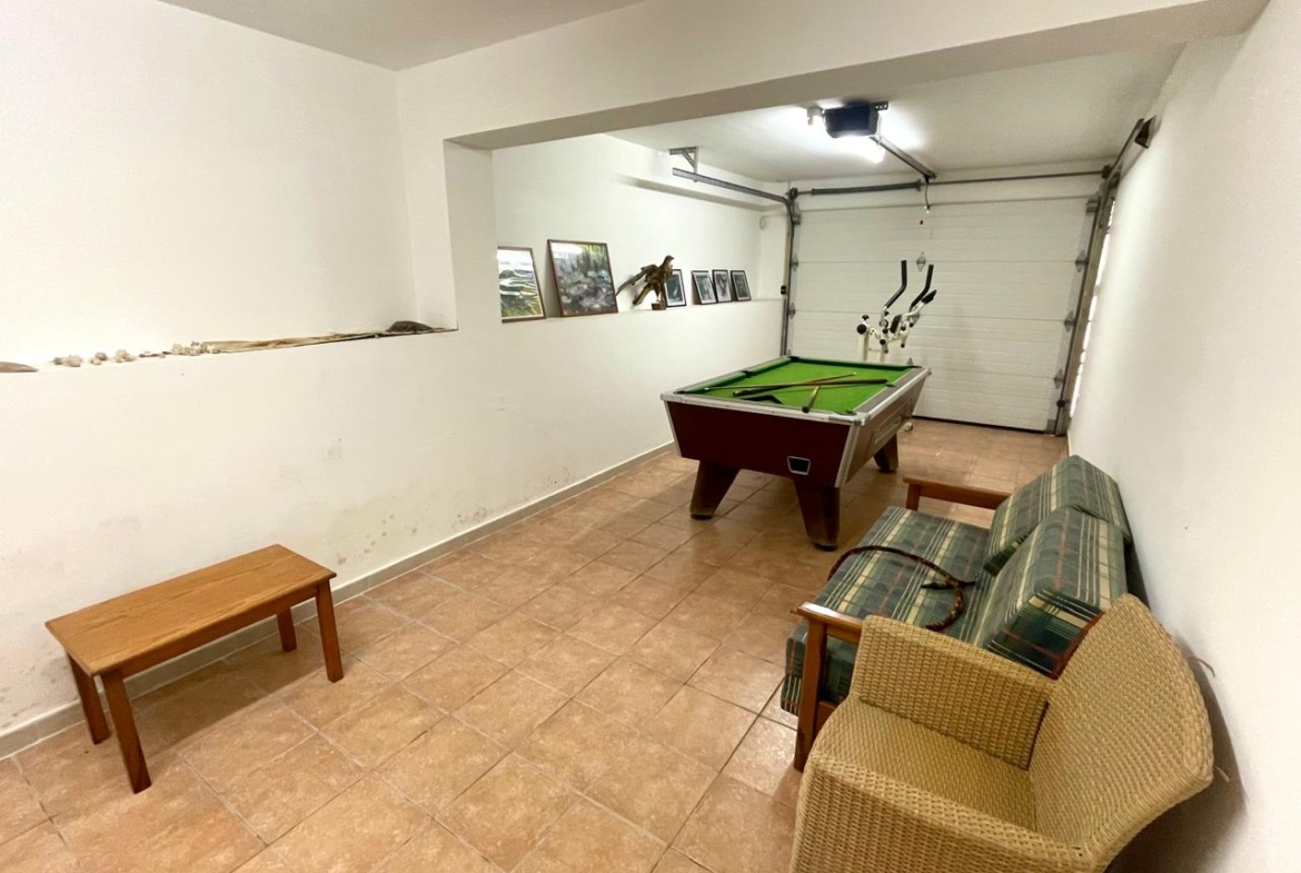 Outside, you can enjoy a beautiful courtyard at the front of the house, a large garden with a swimming pool at the back, a covered parking area, and an additional room in the outdoor space.