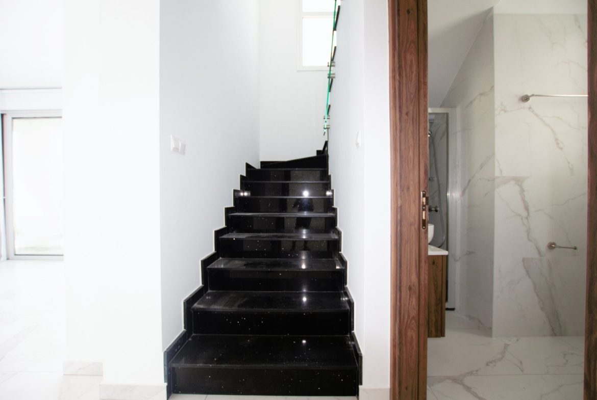 Entering the villa you are welcomed by a spacious open plan living, dining and kitchen area, a guest shower room, a downstairs bedroom as well as covered parking on the ground floor.