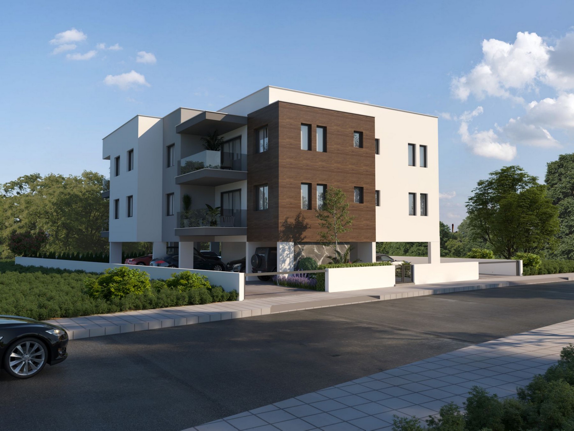 six thoughtfully designed apartments, the building blends minimalist architecture with warm natural elements, a balance of clean white facades and sophisticated wood-textured accents. Expansive