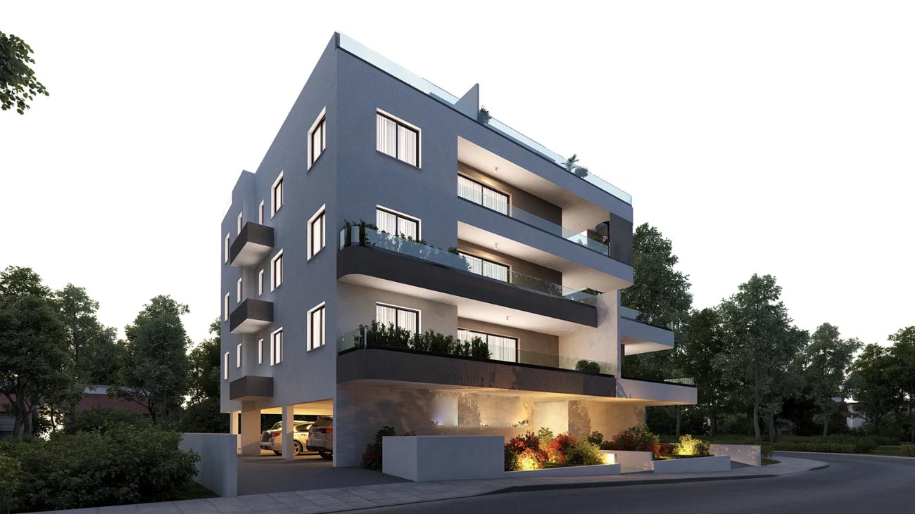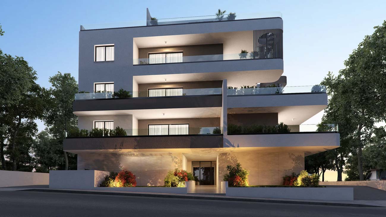 The project is located in Aradippou, Krasas area. The modern design of the apartment building emphasizes detail and ensures residents’ privacy. It is a three-story building with seven comfortable and contemporary apartments. The first floor consists of two two-bedroom apartments and one one-bedroom apartment, while the second floor has two two-bedroom apartments. The third floor includes two two-bedroom apartments with a private roof garden. There is a covered parking space and a storage room for each apartment. The project results from the coordinated design of an experienced team of architects, civil engineers, and interior designers.