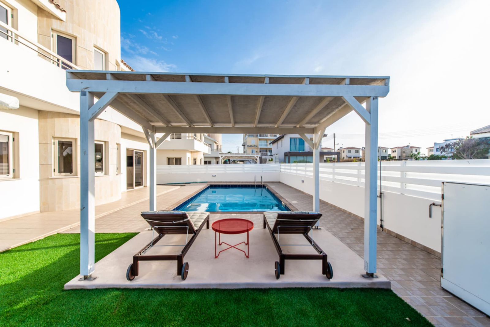 Covered pergola beside the pool—perfect for sunbathing and relaxing