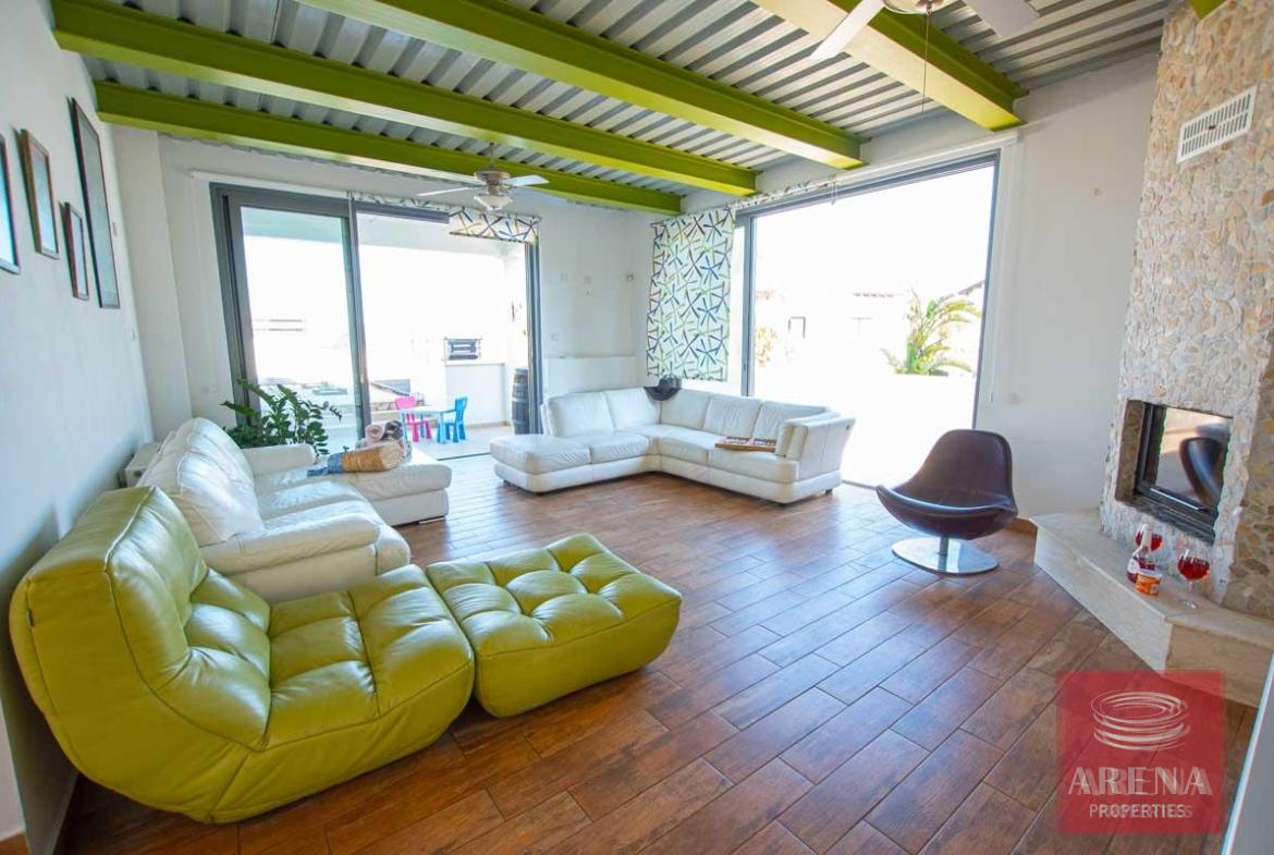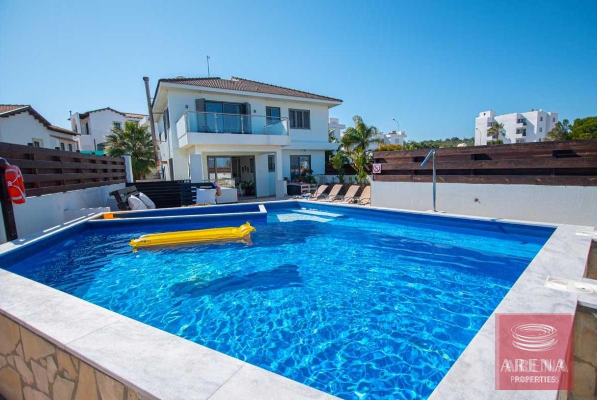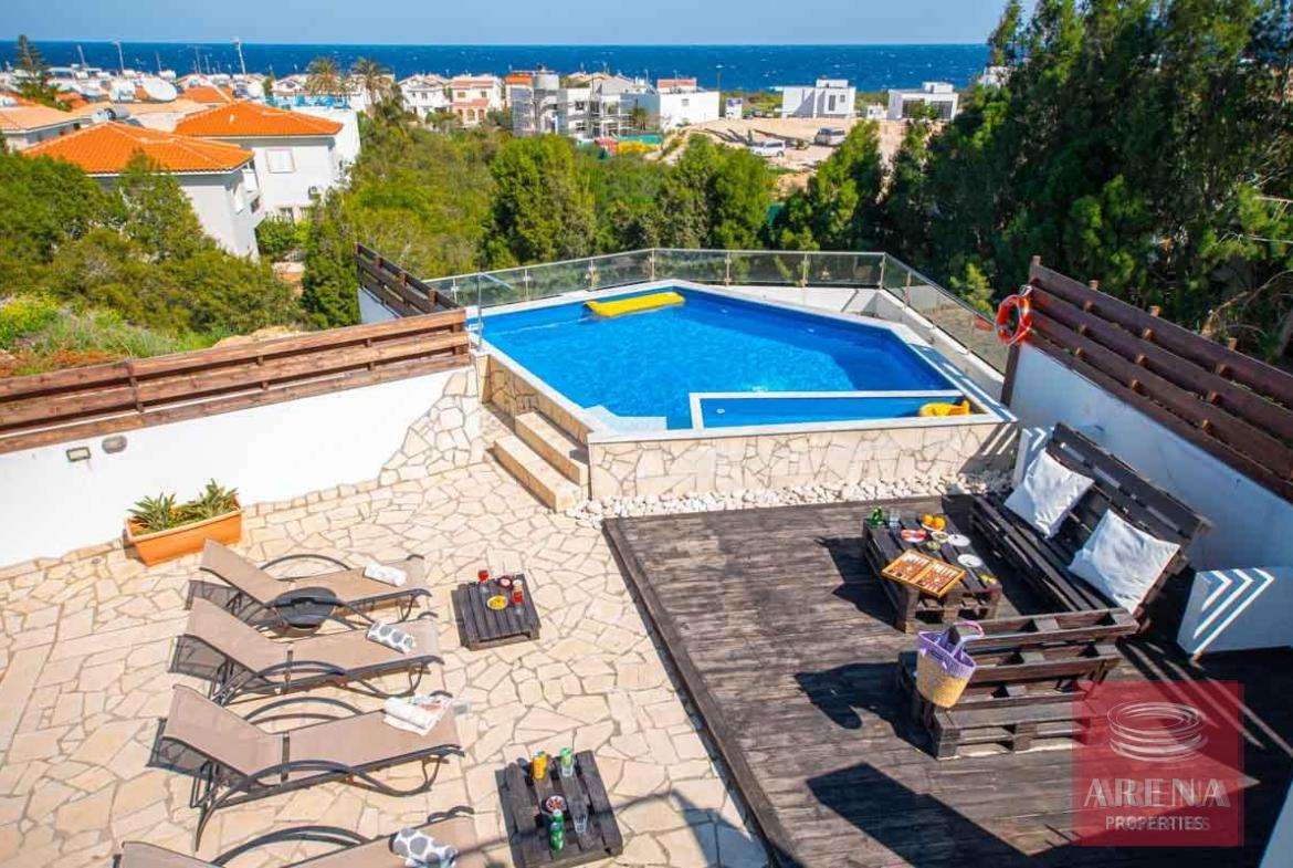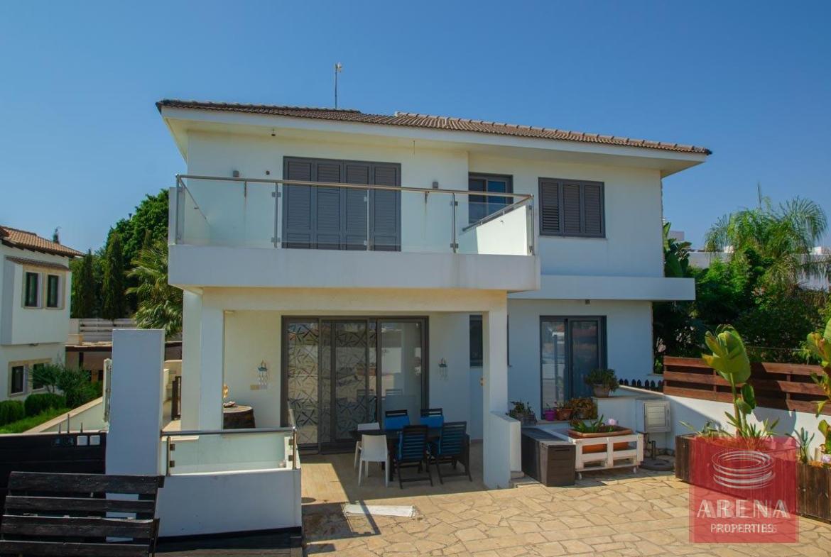 A bespoke, luxury 4 bedroom villa boasting Sea View situated on a quiet cul de sac of only 4 individual properties located in the beautiful nature reserve of Cape Greco, Protaras. The villa has been specifically designed to take advantage of the unique plot, with underground parking, a huge sunny terrace boasting stunning Sea View and a well-maintained garden. The accommodation briefly comprises of a spacious lounge with working fireplace featuring patio doors leading out onto the sunny terrace, a large kitchen with a preparation island, granite worktops and solid wood doors, a guest bedroom/family room/office, guest bathroom and an additional family area on the ground floor, with 3 bedrooms (master with en-suite) and a family bathroom on the first floor. The villa has air condition throughout and also gas central heating, fly screens, ceiling fans, aluminium shutters on the bedroom windows, outside storage, mature garden, and outside BBQ area and so much more!!