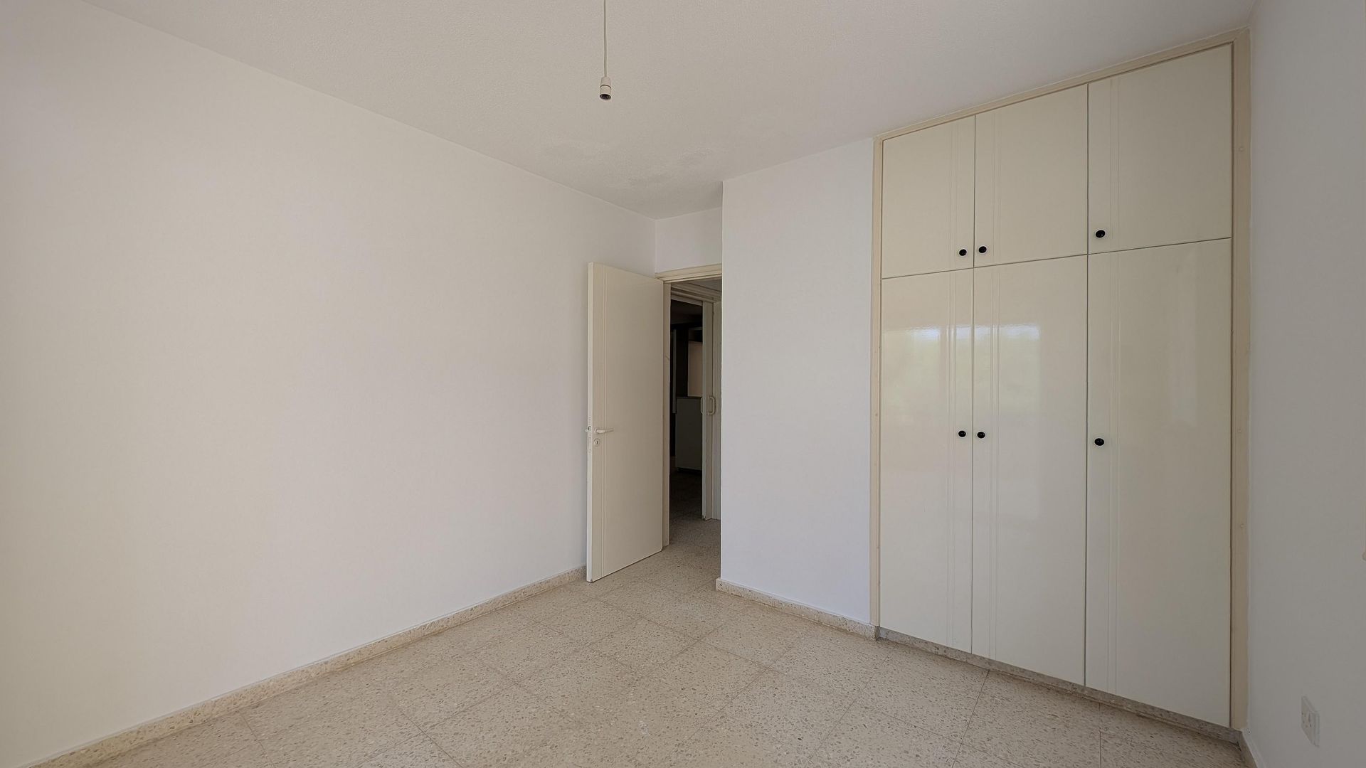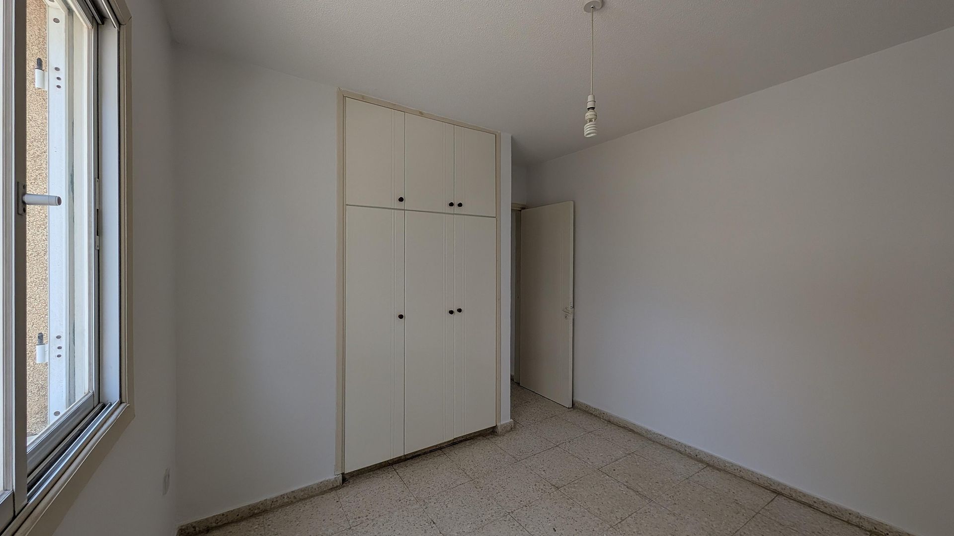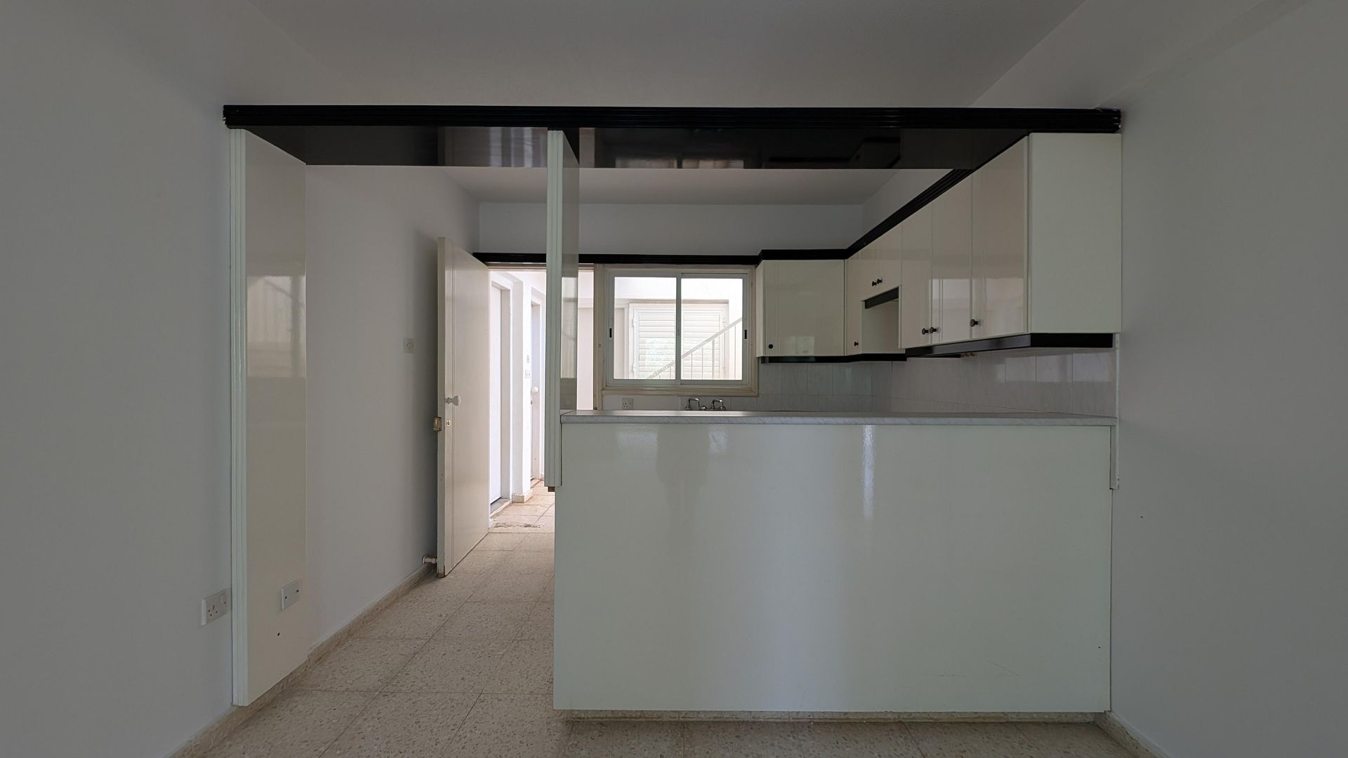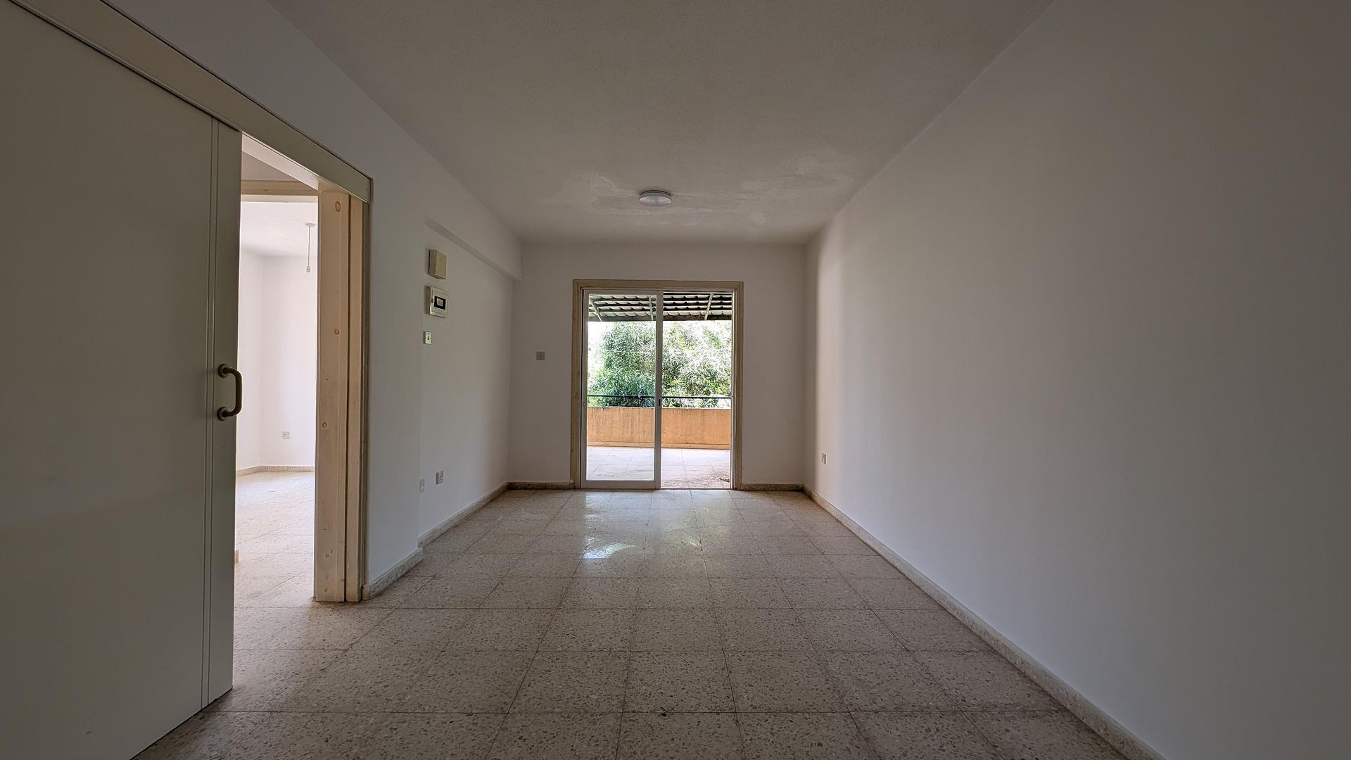 It comprises a living and dining area, a kitchen, two bedrooms, and a bathroom. Interior features include mosaic marble flooring and single-glazed windows.