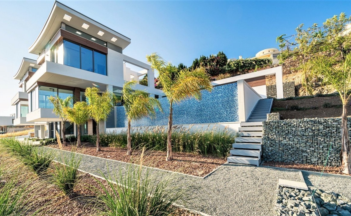 The villa provides a large number of features that enhance its luxurious status and privacy. The access is controlled by two gated entrances, one entrance includes water feature with jets positioned on both sides of the bridge that spans the distance between the garden and the entrance patio. The landscape design preserves most of the natural grey rock slope and further enhanced with the use of boulder walls using identical display walls, an internal garden feature, wine cava and a bar. The villa includes a contemporary design lift, a sauna, a home cinema/office space and maids quarters. The glazing system used, allows for frameless glass corners that enable unobstructed views while maintaining the thermal and sound proofing of the internal areas. The whole of the ground floor and externally accessible entry openings at the 1st and 2nd floors, are fitted with concealed r/c security shutters. The top floor and all externally accessible entry openings at the 1st and 2nd floors, are fitted with concealed r/c security shutters. The top floor bedrooms ceilings are deisgned to provide a loft haracter, with a variable 4 meter average height and fully glazed upper windows. The spacious 6 bedroom plus office suite villa also provides the option of the entirely seperated guest suite. The villa incorporates a 5KW photovoltaic system, concealed hoover system, concealed air conditioning and underfloor heating system.