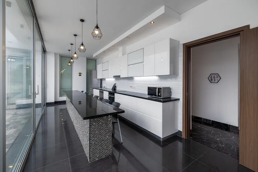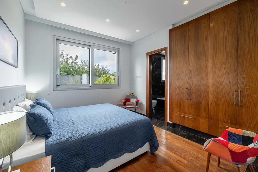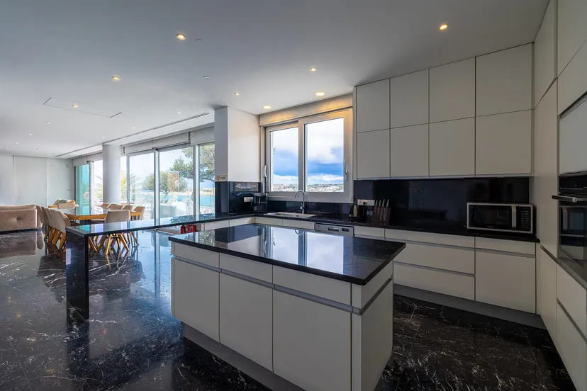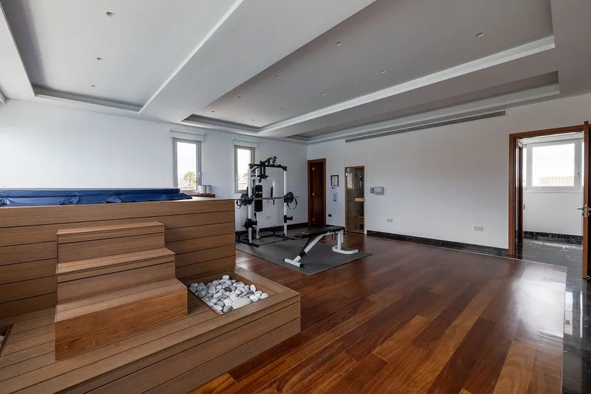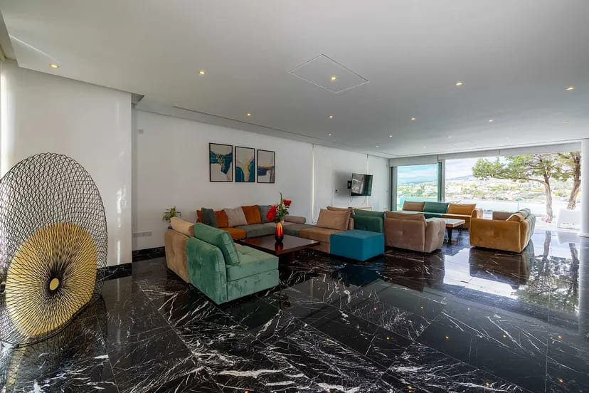 The interior unfolds across three expansive levels connected by a private elevator, featuring grand reception areas, multiple dining spaces, and several outdoor lounges designed for sophisticated entertaining. With seven spacious bedrooms, including a guest suite and private staff quarters, the villa accommodates residents and guests with the utmost comfort and discretion.