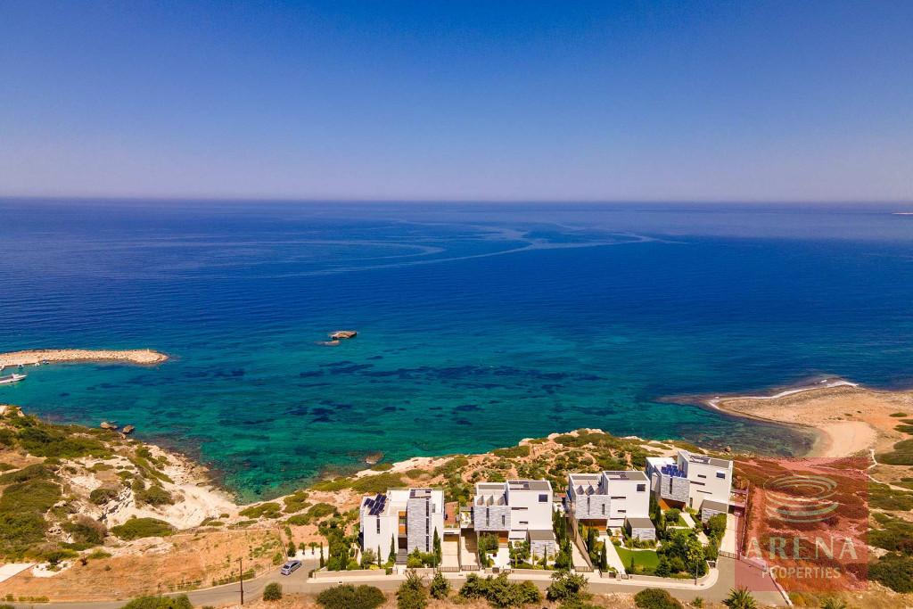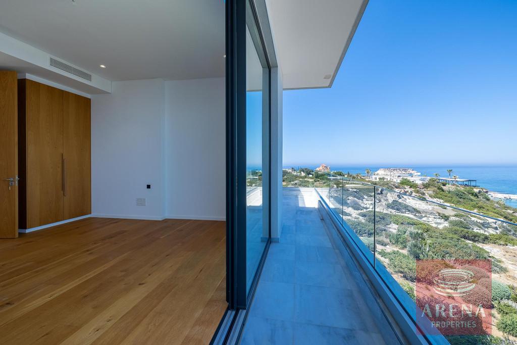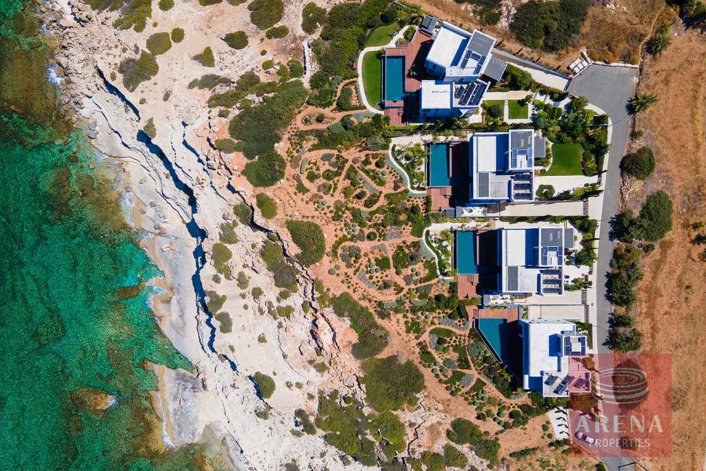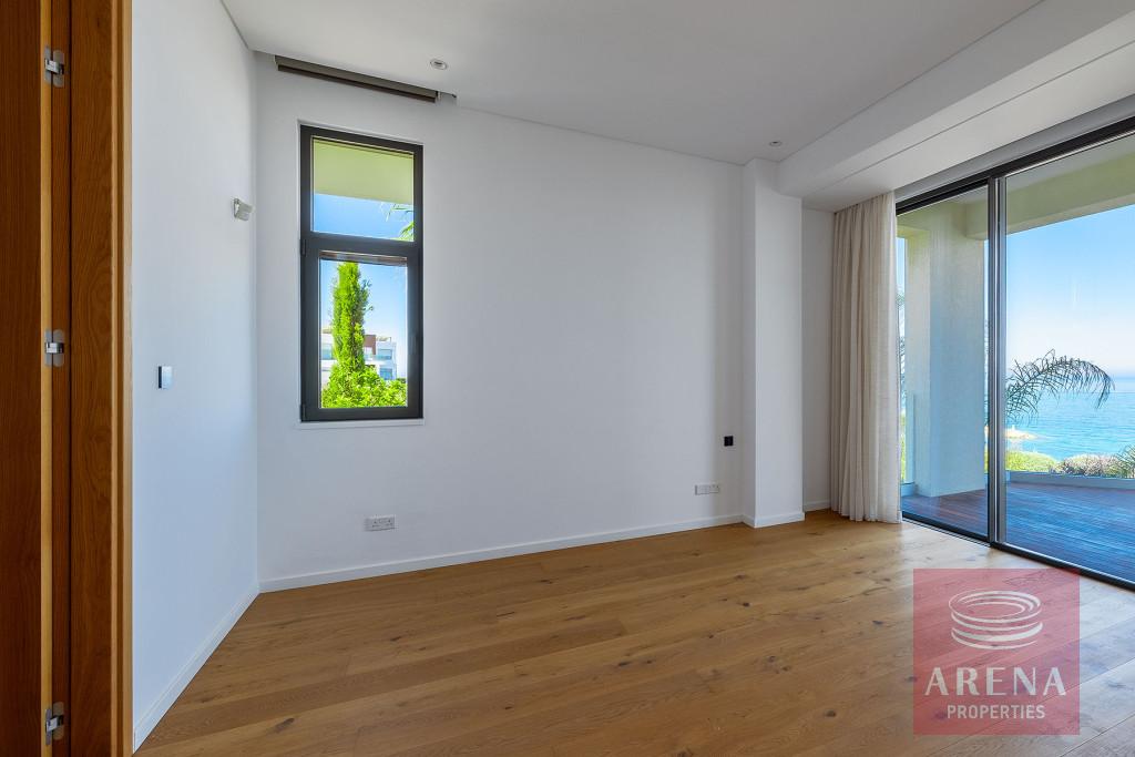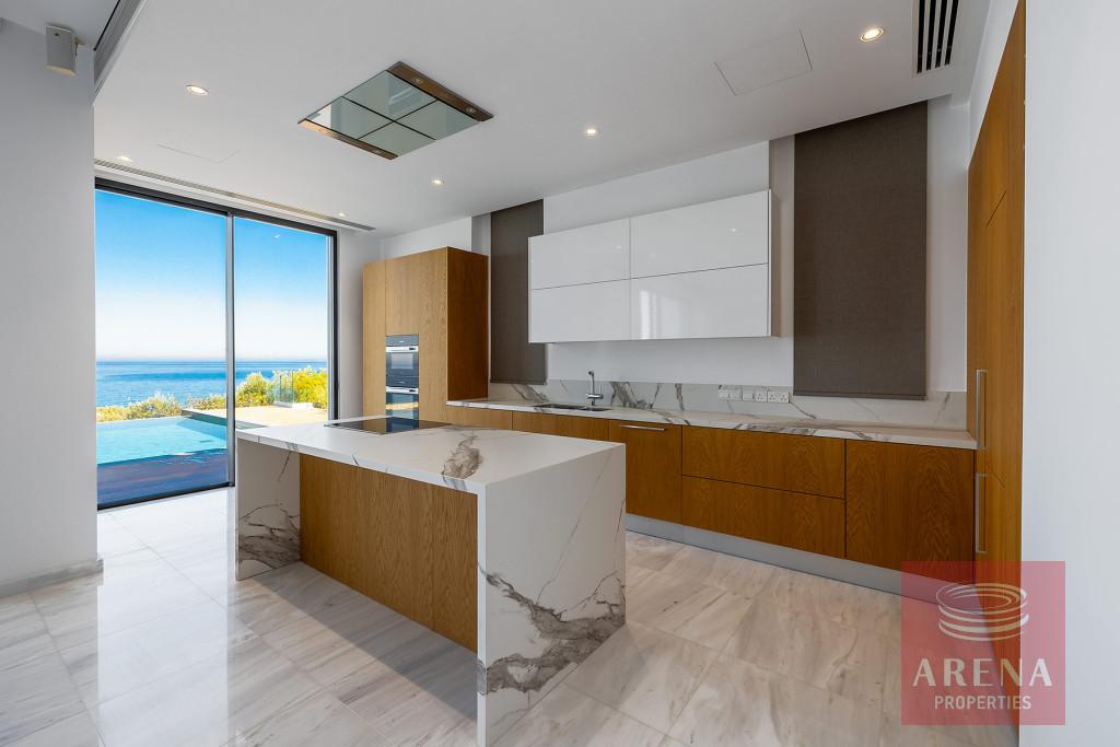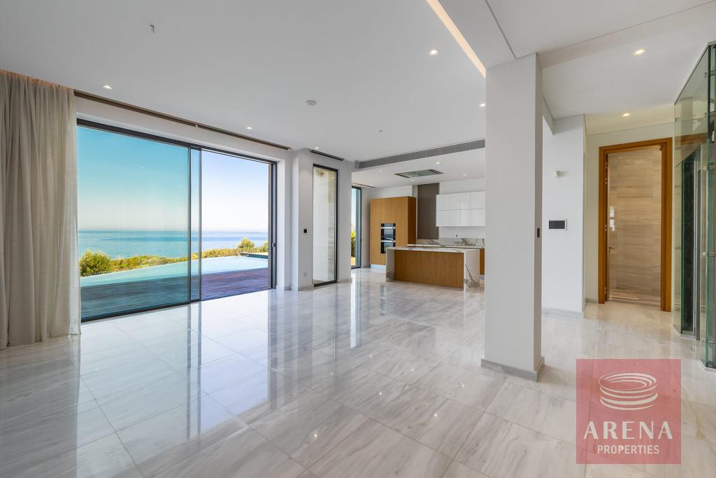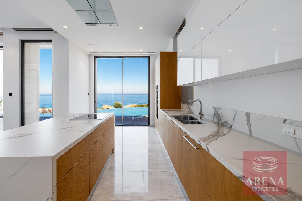 The fabulous, sea-front villa in an exclusive location of Agios Georgios in Akamas Peninsula is immaculately presented with spacious modern Interiors. It offers a large open plan living-dining room and modern kitchen with patio doors leading to a decked terrace. The kitchen has Miele integrated appliances and stone worktops. This level also features a double bedroom with en-suite shower room. A wooden staircase or a Kone lift allows access to all floors of the property. The first floor hosts the master bedroom with a private sea view balcony, a walk-in closet and an en-suite bathroom with a free-standing Villeroy and Boch bath and a walk-in glass shower. The further two bedrooms on the same floor share a walk-in closet, a large shower room, and a lovely balcony. The villa also boasts a wonderful roof terrace and a large basement room perfect as an additional bedroom, maids room, office, gym, or playroom, with a separate utility area and shower room. Additional features include an amazing heated infinity pool, pool river and step bridge, a fire pit, double garage with electronic shutters, underfloor heating, and a central air conditioning system.