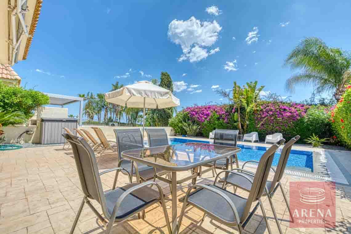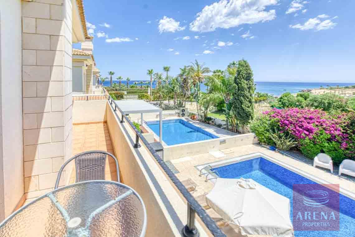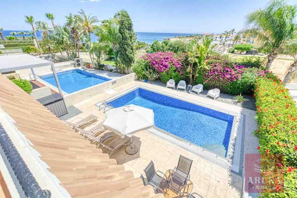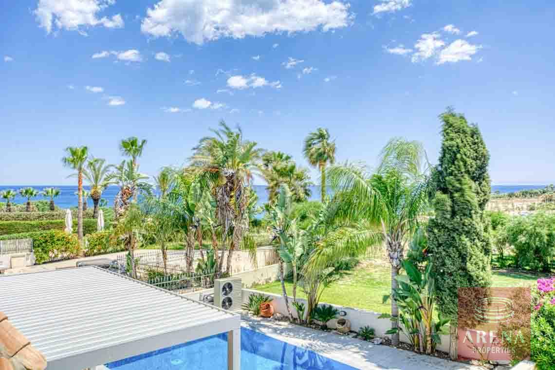 The villa features modern architectural design and dazzling white exteriors that reflect the almost year-round sunshine the island receives. Comfortably spread out in a 300-square meter plots, the villa boasts three bedrooms, and three bathrooms. A neatly landscaped garden extends out to an overflow pool, providing residents with the ultimate luxury of choice: a pool day, or a beach day. Sunny balconies extend out from the higher floors, allowing for unrestricted views of the Mediterranean, as far as the eye can see.